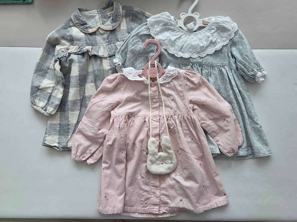 아가방원피스 2개, 밍크뮤원피스 1개 팔아요 오염된부분 없이 상태좋은 편이에요 체크무늬 옷 안에 달린 텍에 아이 이름도장 찍혀있음 토끼가방 포함, 옷걸이 제외