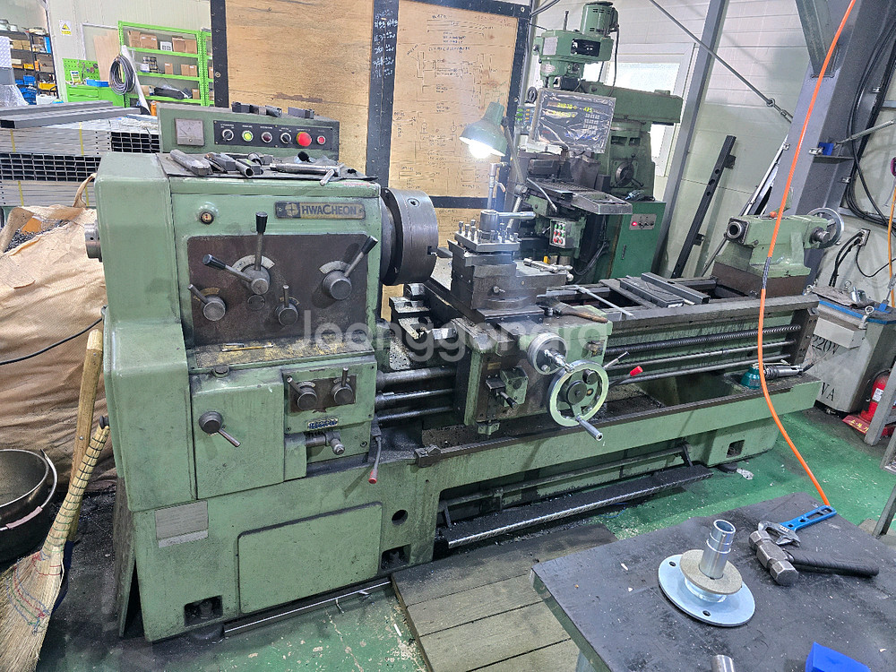 중고 대형 선반이에요. 사용감은 있지만 작동에는 문제없는 상태입니다. 공장이나 작업장에서 바로 사용 가능해요.