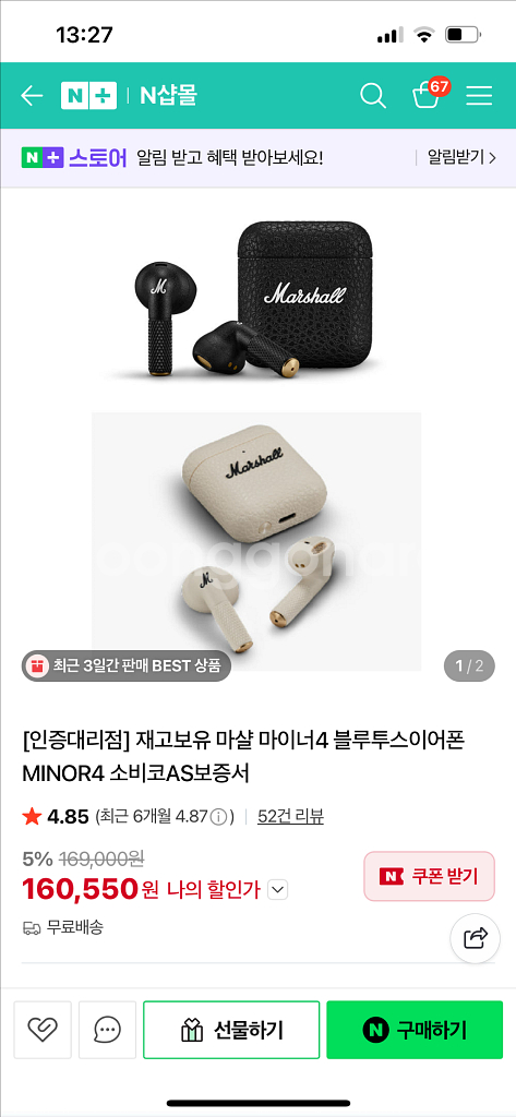 마샬 블루투스 이어폰 마이너4 블랙 미개봉 세제품