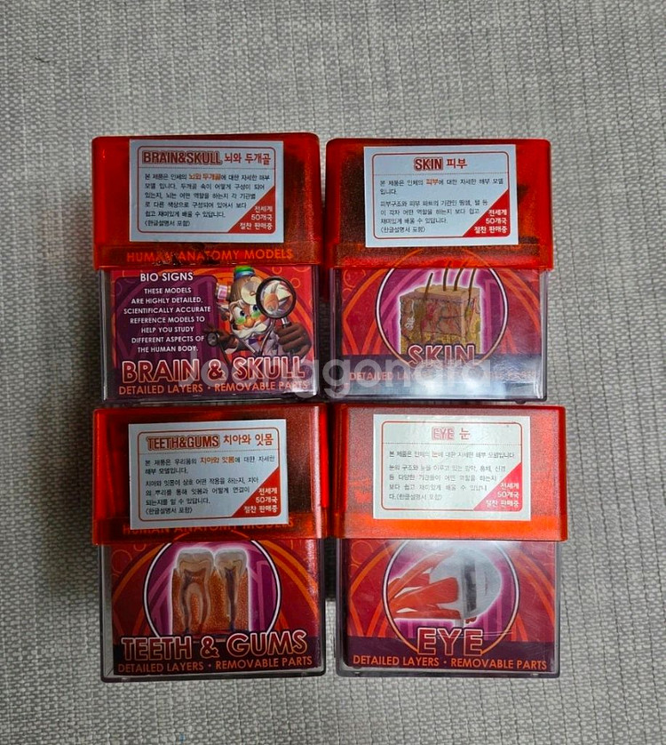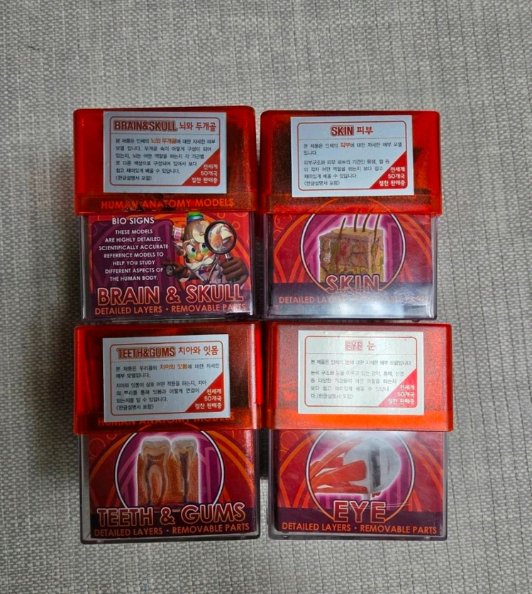개인정보(거래정보)를 주고받는 행위는 사기에 노출될 수 있으므로 즉시 중고나라로 신고해 주세요인체 해부학 모델 세트입니다 뇌&두개골, 피부, 치아&잇몸, 눈 4가지 모델이 있으며, 각 모델은 분리 가능한 부품으로 구성되어 있습니다 각 모델은 인체에 대한 이해를 돕기 위해 제작되었습니다