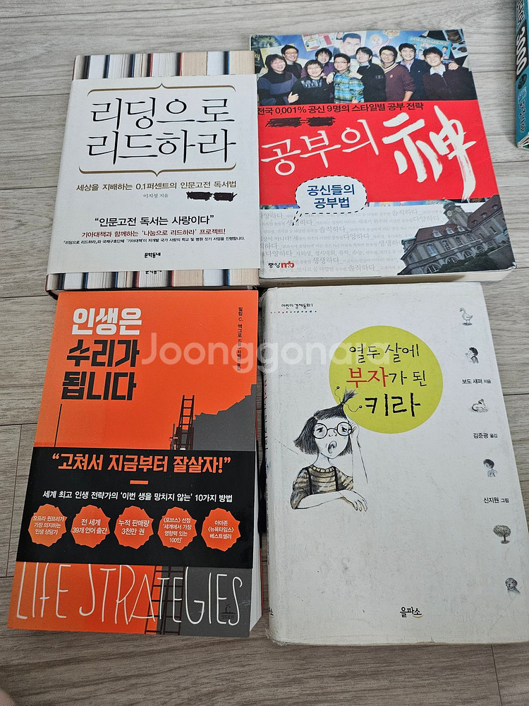 자기계발 및 공부 관련 책 4권 일괄 판매합니다. 구성 리딩으로 리드하라 공부의 신 인생은 수리가 됩니다 열두 살에 부자가 된 키라 사용감은 있으나 읽는 데 문제 없습니다. 일괄 판매합니다. 거래 의정부역 근처 직거래 / 반값택배 +2,000 / 일반택배 +4,000