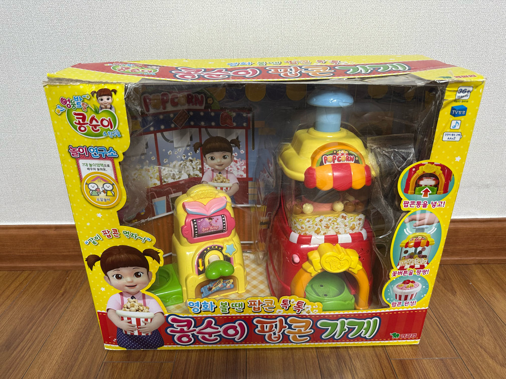 팝콘 가게 장난감이에요! 박스와 구성품이 모두 깔끔하게 보관되어 있고, 아이들이 좋아할 귀여운 디자인의 팝콤팬 버거 장난감입니다. 콩순이 팝콘 가게입니다 구성품거의다 있고 뒤에 X표시 되어있는건 없습니다 소리도 아주잘나옵니다~~ 상태아주 양호합니다