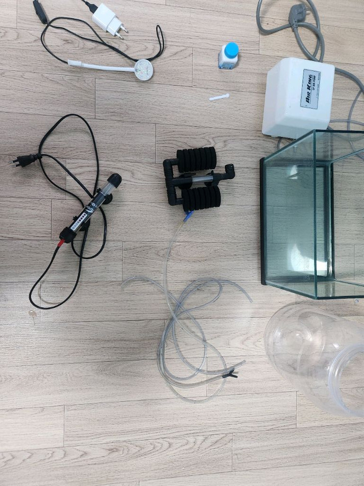 어항 세트 싸게 급처 합니다여과기,물갈이 플라스틱 통,히터,어항,산소공급기,소량베타먹이,led조명,에어호스