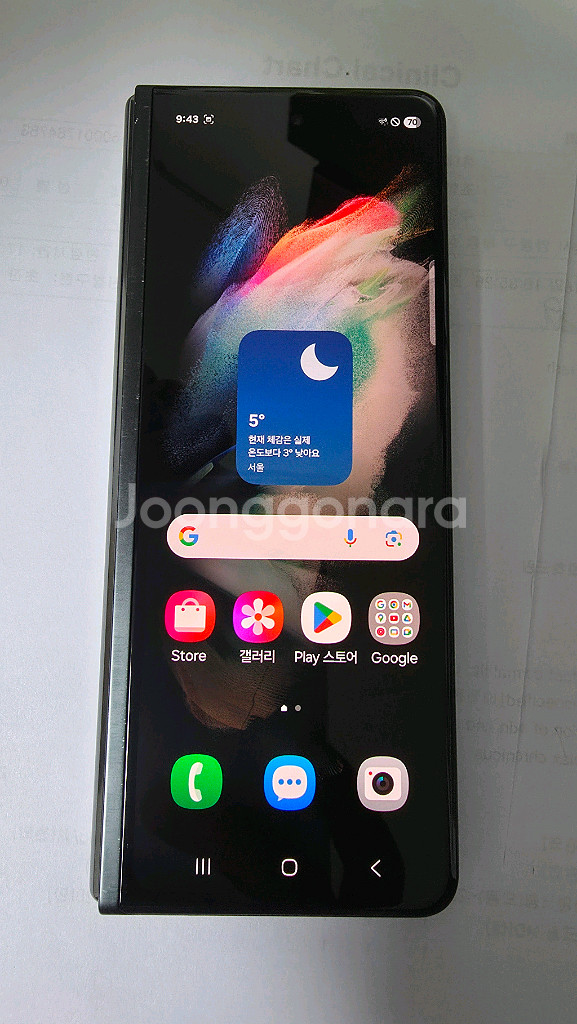 갤럭시 Z폴드3 블랙 색상입니다 화면을 펼쳤을 때 세로로 줄이 하나 생겼습니다(사진 참고) 그리고 내부 액정이 터치에 이상이 있습니다. 액정에기스나 잔상은 없습니다 특히 외부 액정은 아주 깨끗합니다.