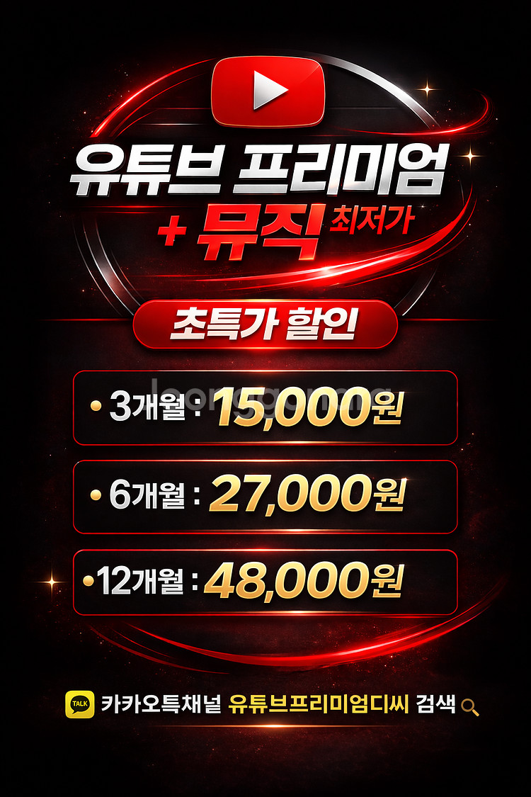 유튜브 프리미엄 최저가 제공 해드립니다. 광고 없이 쾌적한 이용 안정적인 이용 환경 제공 빠른 처리와 지속적인 관리 구매 이후에도 문제 발생 시 끝까지 책임 대응해드립니다. 안정적인 이용과 신뢰를 최우선으로 운영합니다. 깨톡 : 유튜브 프리미엄 디씨 검색하셔서 채널로 문의주세요! 가족 요금제 3개월 – 15,000원 6개월 – 27,000원 12개월 – 48,000원