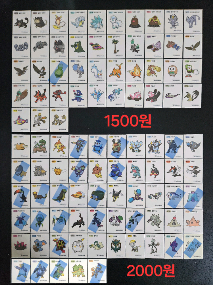 포켓몬 시즌4 띠부씰 판매합니다 울트라네크로즈마 멜탄 멜메탈 루나아라 크레세리아 쉐이미 다크라이 등 레어씰 많아요. 장당1500원부터 사진에 금액 적혀있어요 5장 이상 판매합니다. 파란색 체크표시는 품절이에요