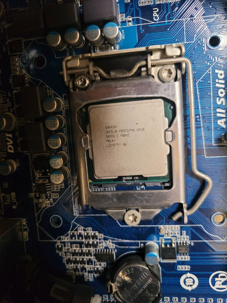 인텔 펜티엄 G850 CPU와 메인보드 세트입니다 CPU에 SR052 2.90GHz, MALAY L229B797라고 적혀있습니다 메인보드에는 All Solid Capacitors, Socket 1155라고 적혀있습니다 렘은 2기가 두개 총 4기가 입니다 안결은 안해요