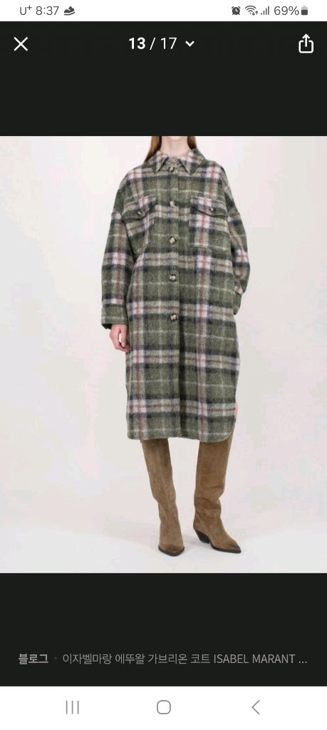 이자벨마랑 가브리온 오버사이즈 체크울블렌드 블랭킷 코트 - 녹색 계열의 체크 패턴이 돋보입니다 - 셔츠형 코트 디자인으로 캐주얼하게 연출 가능 - 아크릴, 폴리에스터, 모 혼방 소재로 제작되었습니다 자연스러운 입음감외 상태양호해요 사이즈T1 가슴반품79 총장109