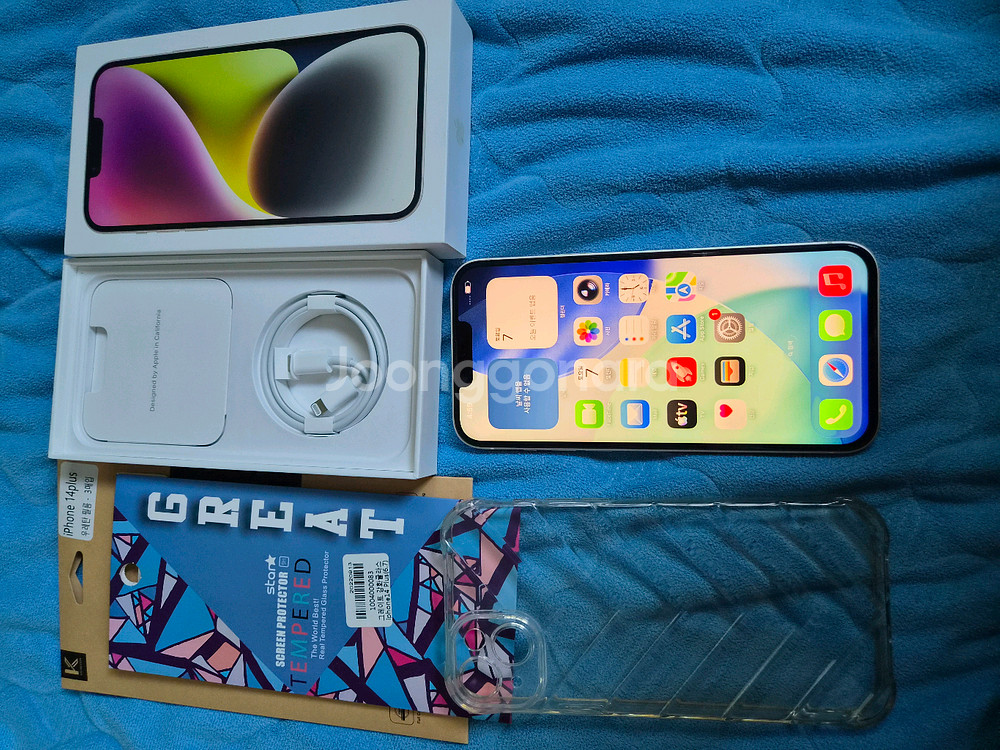 아이폰 14플러스 128 구성 미사용 구성품 우레탄필름3 강화유리1 케이스 기기 입니다 배터리 성능은 81%입니다 상태는 좋구요 현제 우레탄 필름 붙어 있습니다 액정은 한번 사설로 수리 했습니다 기능 이상 없음 구매시 환불 불가