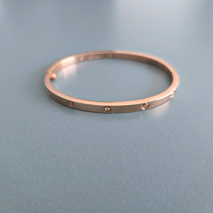 써지컬 러브 브레이슬릿이에요. 로즈골드 컬러로 고급스럽고 상태도 깔끔합니다. 클래식한 디자인으로 데일리 착용하기 좋아요. 새상품이고 16호에요 저한텐 너무커서 팔아요.