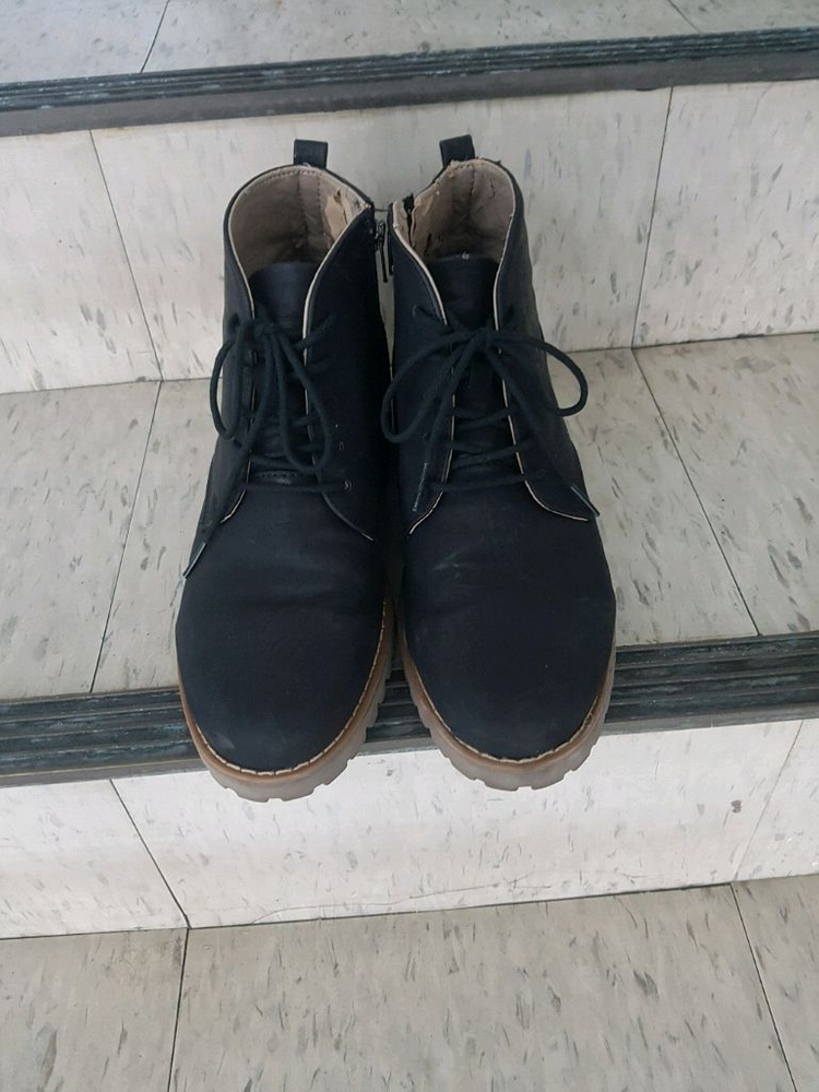 검정색 남성 부츠입니다 끈으로 묶는 스타일이고, 밑창은 갈색입니다 Made in Korea 제품입니다 전체적으로 사용감이 있습니다