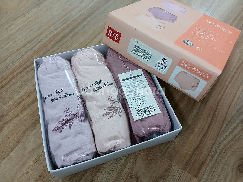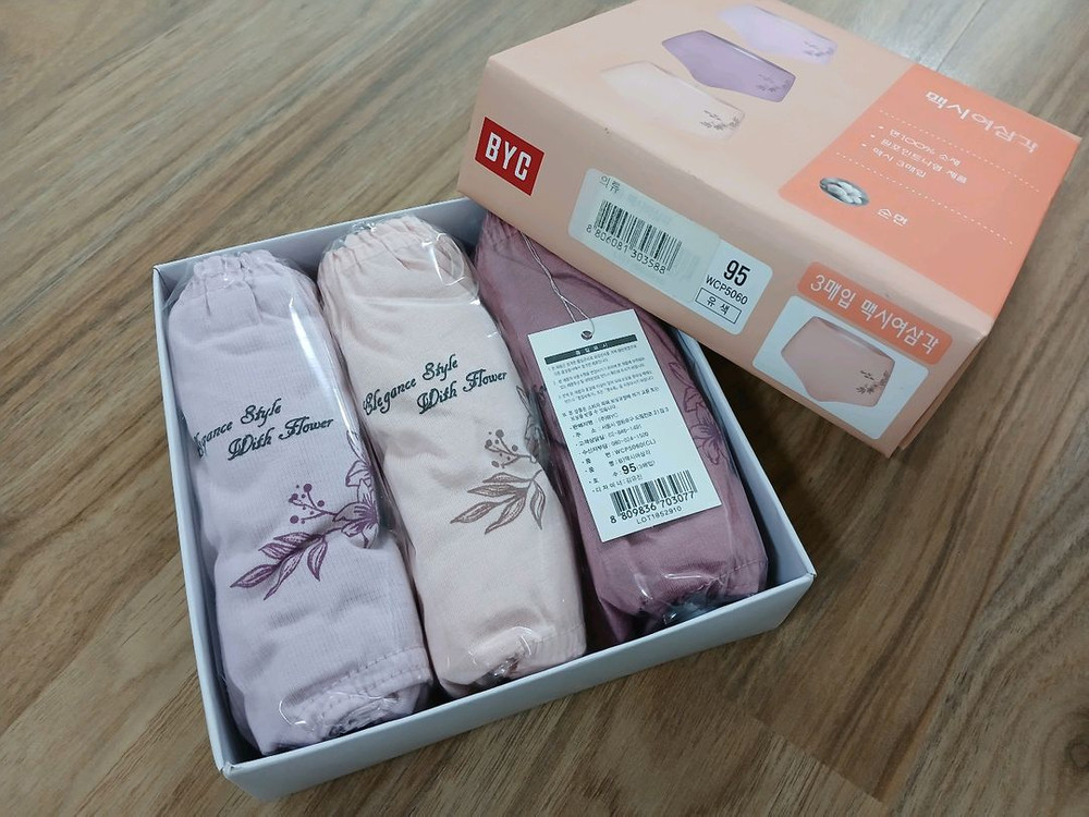 BYC 여성 맥시 팬티 3매 팝니다. 면 100%, 사이즈 95, 모두 12,000원입니다. 서울시 상계9동 청원고등학교 후문 또는 지하철 7호선 마들역에서 직거래 가능합니다. GS 반값택배 1,900원 가능합니다. 에눌, 네고 사양합니다.