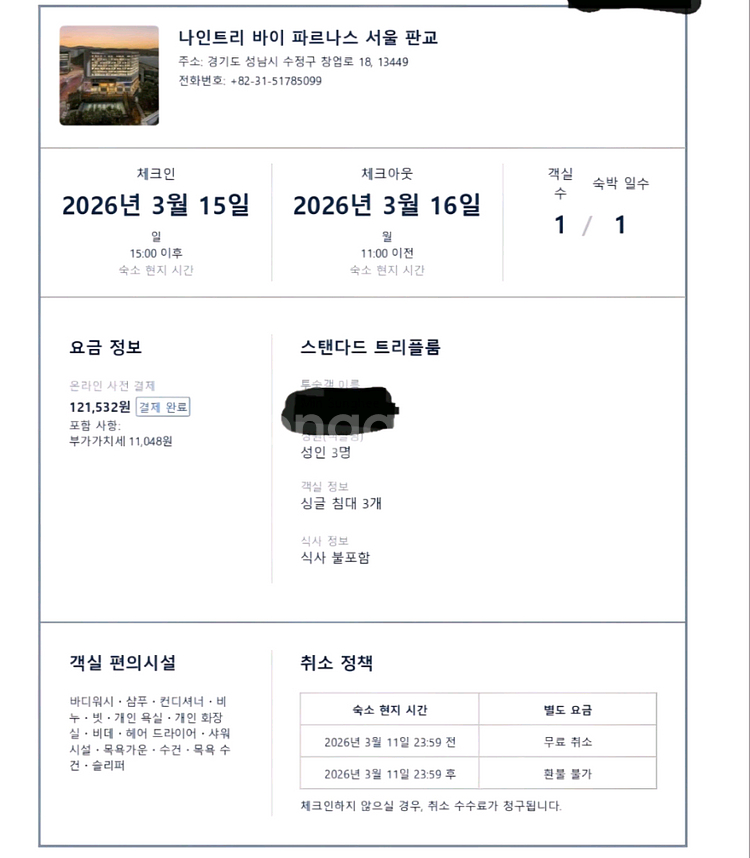 나인트리 바이 파르나스 서울 판교 스탠다드 트리플룸 숙박권입니다. 2026년 3월 15일부터 1박 2일 사용 가능합니다. 싱글 침대 3개로, 성인 3명까지 이용 가능하고, 조식은 불포함입니다. 부가세포함 12.1만 >>> 7.0만