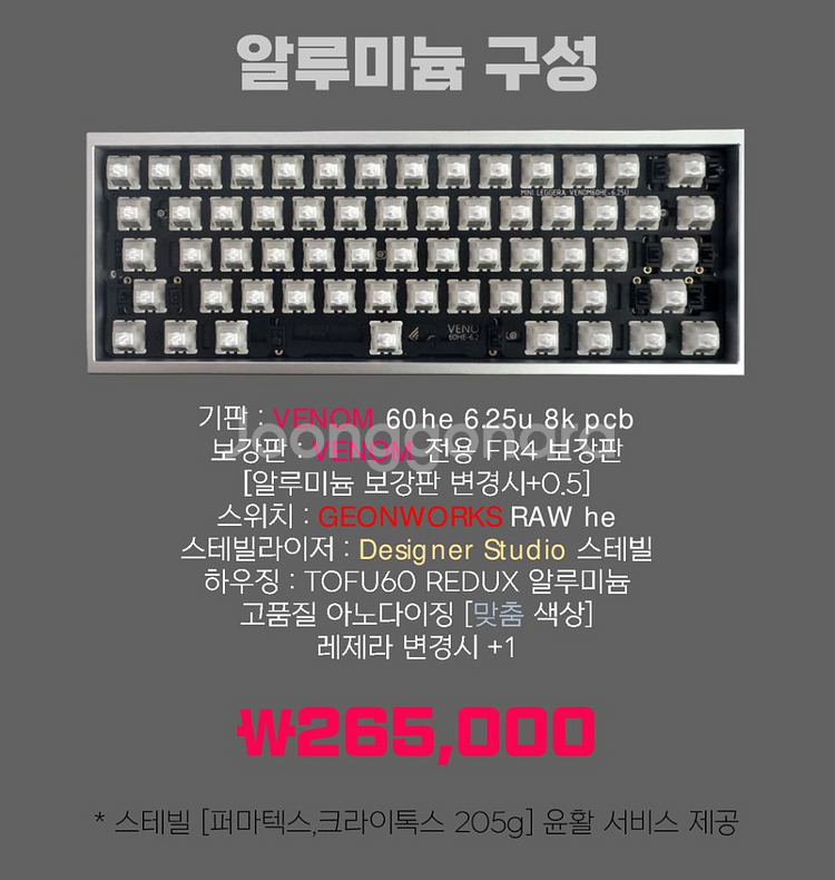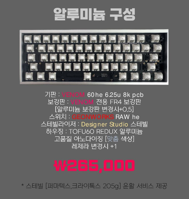 💡베놈 제작이력 수백대 이상! 💡A/S 5년보장 기판 문제 발생시 문제에따라 적극 조치 💡계좌 결제 위주로 비교적 낮은 안심결제 후기 허나 엄청난 거래량 보유중 [안전결제 환영합니다] 💡타 공방대비 정상적인 재료 가격측정으로 합리적인 가격에 판매하며 막대한 이익을 챙기지 않고 판먀 💡아카데미, 프로게이머 여성프로씬에서도 이공방에 베놈 등장 💡유저와 소통하며 제작 진행 문의및 궁금하신 사항 항시 대기중 잦은 질문에 차단하는 공방들이 많아 저는 소통합니다 💡중국 저렴한 보강판 등 철저히 사용x 한국정발 제품들 위주로 사용 💡매 제품마다 장갑착용후 완벽하고 철저하게 빌드하며 위생점검 후 발송 [2월 케이블제공 잠시 보류중입니다!] 알루빌드의 경우 모든 스위치 변경 무료 최근 공방도 아닌곳에서 공임비 사기로 물건을 비싸게 팔아오고있습니다 판매내역도 없는데 판매된척 하는 사기공방도 많으니 주의하세요! tofu60으로 30초중반 되기 쉽지 않습니다. 타공방 같이 초보자가 속여서 빌드하는게 아닌 400대 이상 베놈을 조립한 경험자입니다 Raw he보다 평가가 좋은 Raptor v2[아스트로링크 금형]출시 현재 가능합니다 RGB기판의 경우 보내주셔야 제작 가능한데 문의한번주셔요 구매의향만 있으시면 거래내역 모두 보여드릴 수 있습니다 더이상 공임비 명목하에 10만원 뜯어가는 사기에 당하지마세요 Tofu60redux [모든색상] 베놈60he 6.25u 래피드트리거 기판 raw he 기본옵션 [Raptor v2 변경가능] 베놈 전용 fr4보강판[알루변경시+0.3] 흡음재 작업 디자이너 스테빌 [윤활및 수평작업] 키캡[기본 블랙화이트(0.7),sfc1990(1.5)레제키캡(1.5),망가키캡(1.5) 그외 가격상이