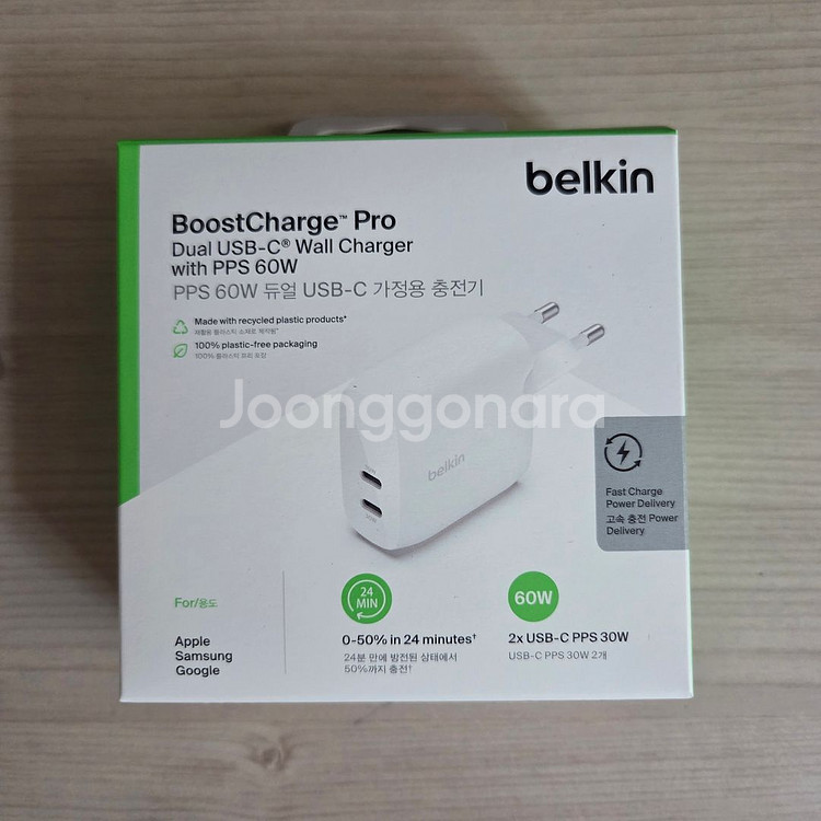 벨킨 부스트차지 PD PPS 60W 2포트 충전기 WCB010kr 미개봉 판매합니다. 용인대학교 부근에서 직거래 또는 편의점 택배로 발송합니다.