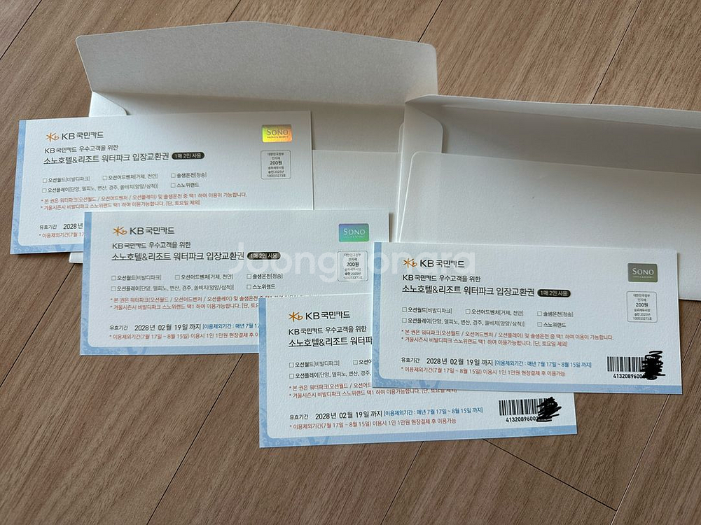 오션월드 (비발디파크) 오션어드벤처 오션플레이 솔샘온천 스노위랜드 이용 가능한 입장교환권 팝니다. 이용 가능기간은 2028년 2월 19일까지이며, 7월17일~8월15일 성수기 기간에는 1인당 1만원 추가금액 현장결제후 이용 가능합니다. 1매 2인 이용권이며, 총 4매 (8인) 있습니다. 2매(4인)에 9만원으로 팝니다. 남가좌동 인근 직거래 가능하고 등기우편, 택배시 3천원 입니다. 총 4매 일괄 구입시 배송료 제가 부담합니다. o1o-2122-1158로 문자나 전화주세요 ^^
