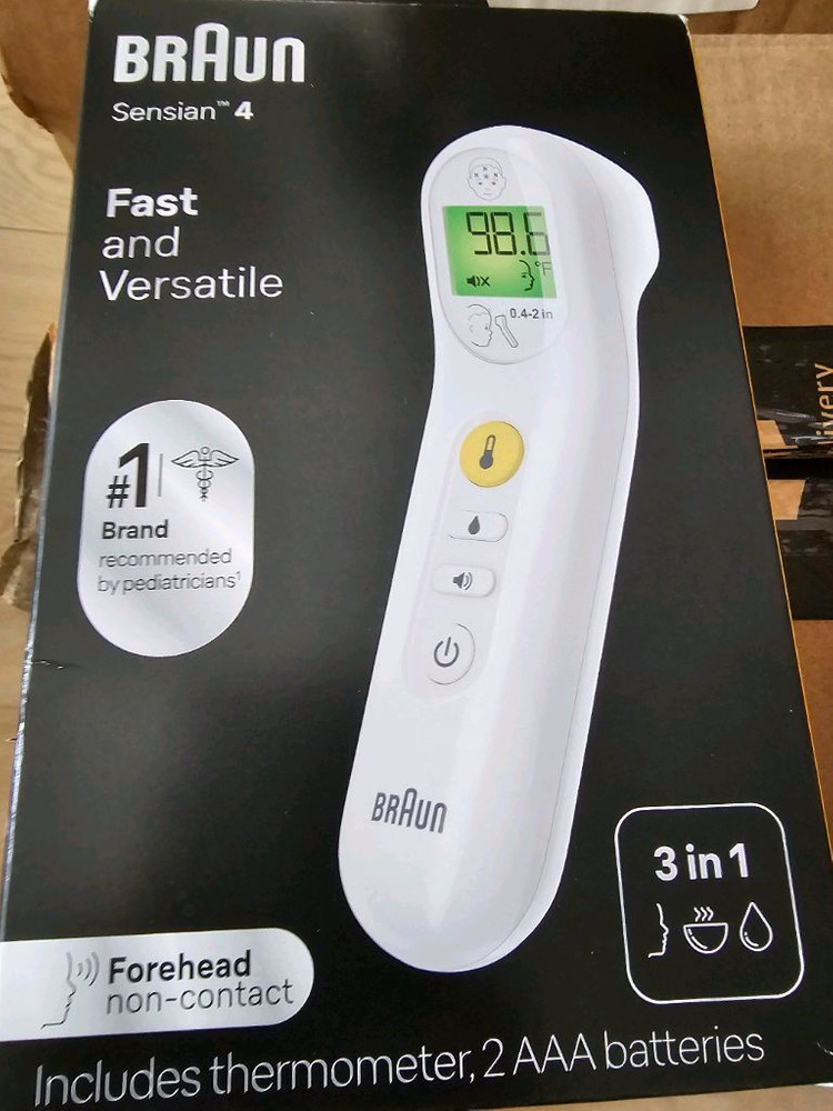 브라운 체온계입니다 - 빠르고 다용도로 사용 가능합니다 - 비접촉식 이마형 체온계입니다 - AAA 배터리 2개가 포함되어 있습니다 미국 직구상품으로 온도표시도 설정가능합니다. 개봉만해본 새상품입니다.