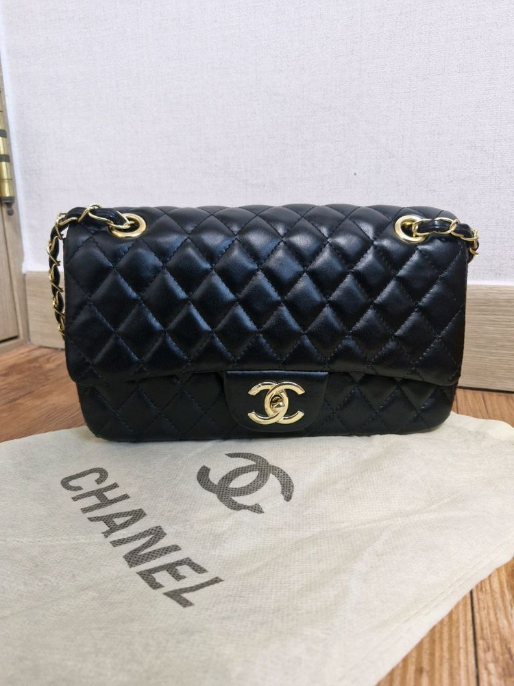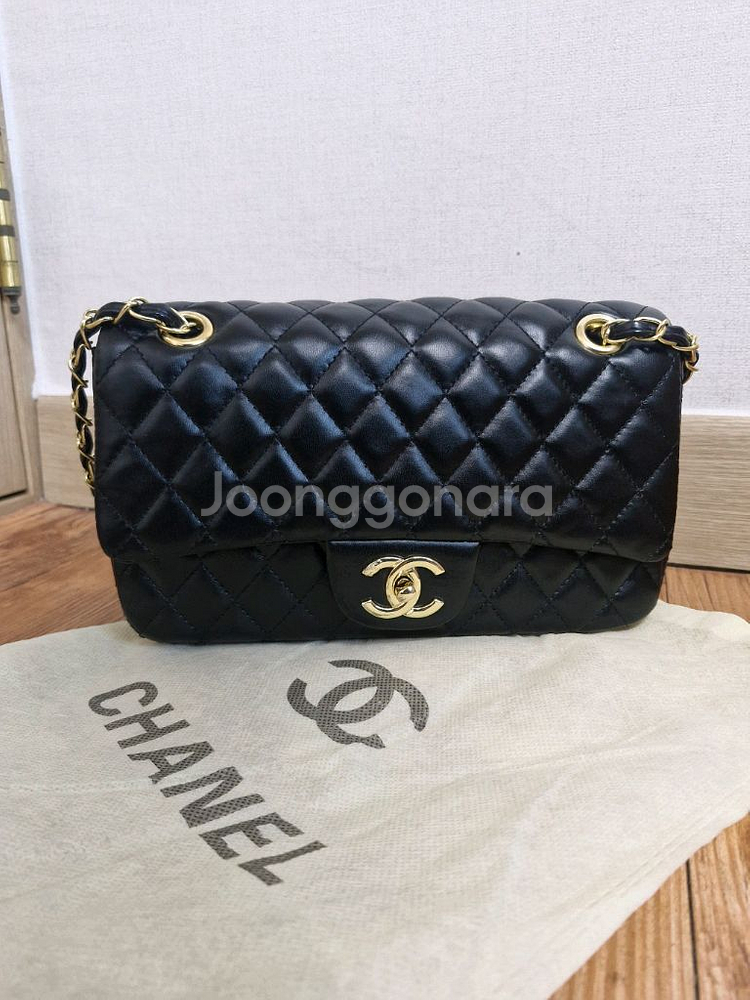 샤넬 클래식 플랩백 미듐 사이즈예요. 블랙 퀼팅 레더에 골드 체인과 로고가 고급스럽고, 더스트백도 함께 드려요. 상태 양호한 새제품입니다. 더스트 구성이예요. 안에 샤넬 로고 있어요. 25*15*6.8 안전결제전 채팅한번 주세요. 정품문의X 찔러보기X 쓸데없는 질문 답안함. 차단함. 쿨거래 하실분만 채팅주세요. 2개이상 하실분은 네고해드려요.