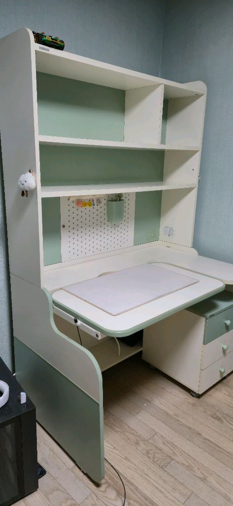 아이용 책상과 수납장이 함께 구성된 세트예요. 화이트와 민트그린 컬러 조합이 깔끔하고 예쁘며, 서랍과 선반으로 수납력도 좋아요. 사용감은 있지만 전체적으로 양호한 상태입니다. 책상 상판은 패드사용으로 비교적 깨끗하며 밑 3단 수납장 제외입니다 김해 리바트 매장에서 직접 구매했습니다