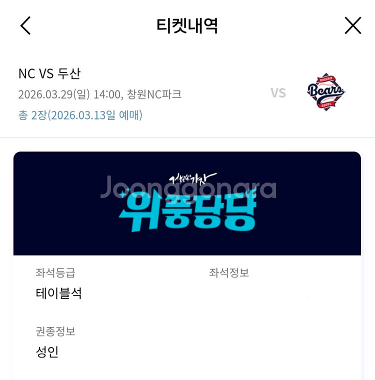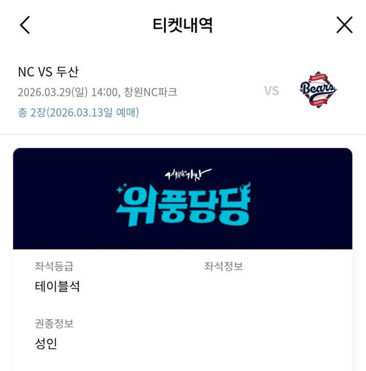 2026시즌 개막시리즈 3월 29일 일요일 NC다이노스 vs 두산베어스 테이블석 2연석 양도합니다. 112구역 맨뒷열 2자리입니다. 일요일에는 다른 일정으로 못 가서 원가양도합니다. 2자리에 13만 8천원입니다.(수수료 포함) 시즌권이라 오늘 예매 완료했습니다. 연락주세요.