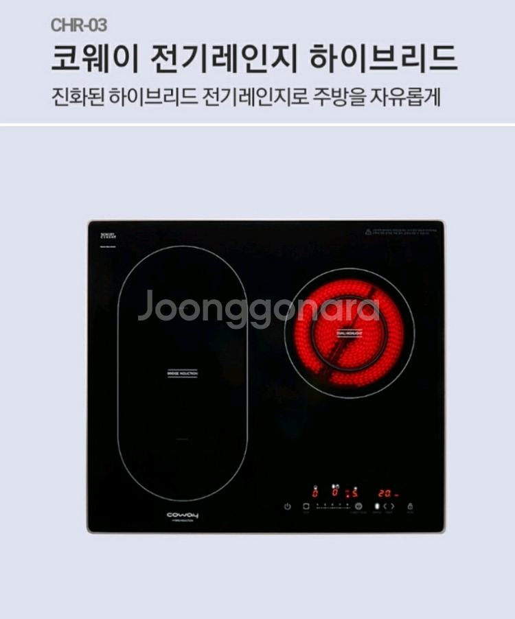 코웨이 CHR-03 하이브리드 전기레인지 판매합니다 - 인덕션 2구, 하이라이트 1구 구성입니다 - 세라믹 글라스 상판으로 청소가 용이합니다 - 박스, 설명서, 세라믹 클리너 포함되어 있습니다 - 크기는 580x510x58mm입니다 - 안전장치가 있어 안심하고 사용 가능합니다