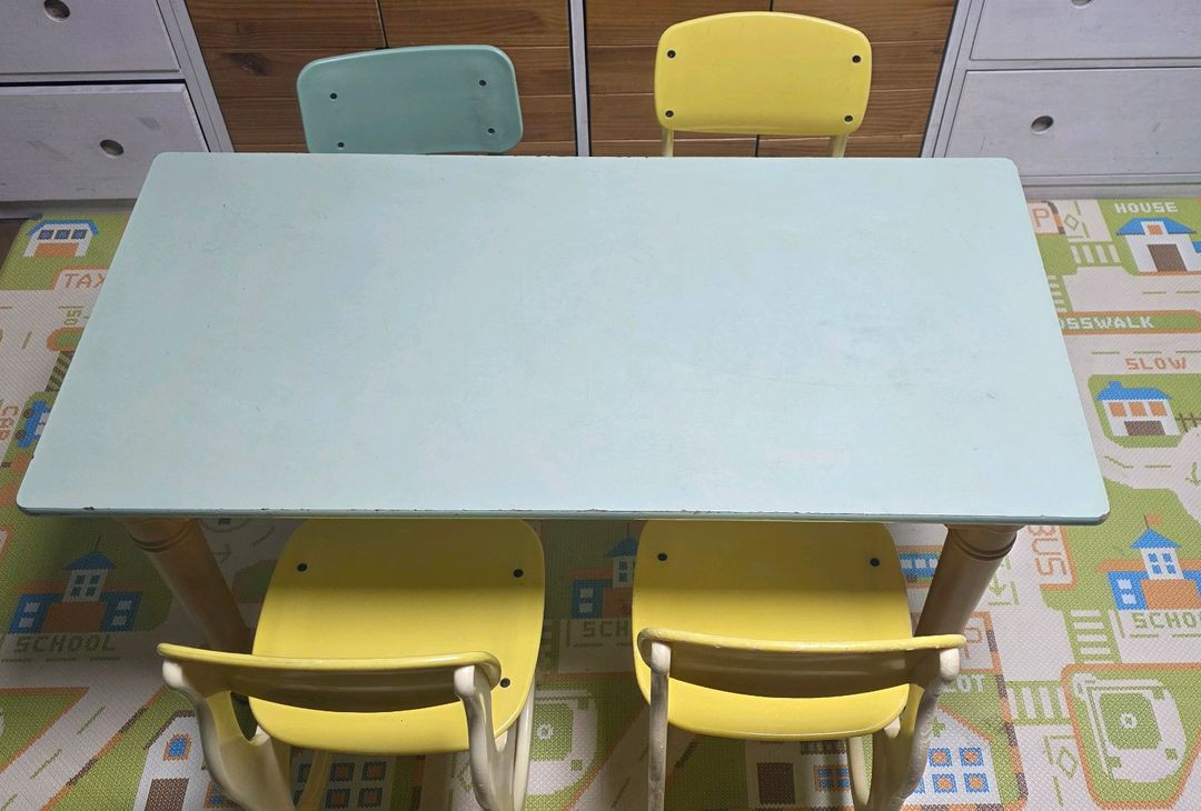 아동용 책상과 의자 4개 세트예요. 민트색 상판과 노란색 등받이가 예쁘고 아이들이 사용하기 좋은 크기입니다. 전체적으로 깔끔한 상태로 보관되어 있어요. 계속사용하던 했고 사용감은많지만 튼튼하고 막 사용하기좋아요. 예민하신분은 패스해주세요. 제생각이지만 애들키워보니 이런거 비싼거 쓰실필요없어요^^;막쓰다 드림하심될듯요. 차에 같이 실어 드릴 수있어요 사이즈 100*50*50이예요