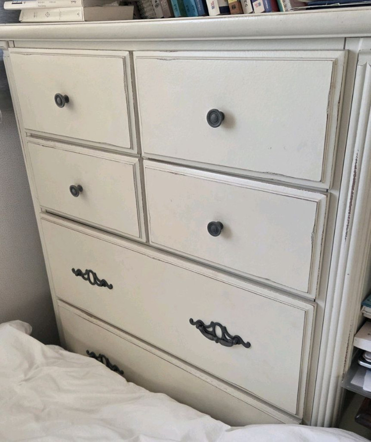 화이트 쉐비 5단 서랍장입니다. 앤틱 가구 특유의 묵직한 존재감과 카로데코만의 섬세한 화이트 도장이 돋보이는 제품이에요. 5단이라 수납력이 정말 넉넉해서 안방이나 거실 어디에 두어도 분위기가 확 살아납니다. [상태 및 참고사항] 브랜드: 카로데코 정품 디자인: 화사한 화이트 쉐비 스타일 (빈티지 가공) 참고사항: 오랜 시간 소장하다 보니 손잡이 4개 정도가 헐거워지거나 고장 난 상태입니다. 인터넷이나 앤틱 소품샵에서 판매하는 예쁜 손잡이로 교체하시면, 세상에 하나뿐인 나만의 가구로 변신할 수 있어요. (손잡이 교체 비용 감안하여 가격을 책정했습니다.) 전체적인 프레임이나 서랍 레일은 카로데코 제품답게 아주 튼튼합니다. [가격 및 거래 정보] 가격: . 손잡이 수리비를 감안해 8만 원 위치: 평택 (부피가 있어 직접 가져가시거나 용달 부르셔야 합니다.) 🎈"함께 올린 카로데코 식탁과 같이 구매하시면 조금 더 시원하게 가격 조절 해드릴게요" 사이즈 :가로 88×세로 136