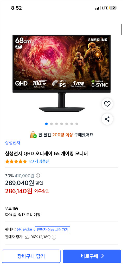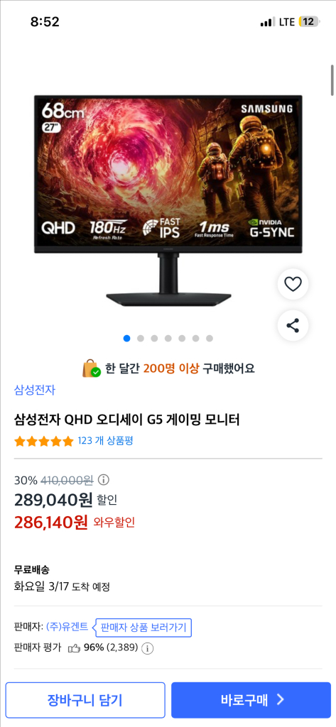 친한 형님이 선물주신 최신형 모니터 팝니다 오늘 택배 도착했고 박스에 송장 붙어 있습니다 (3/14) 삼성 오디세이 G5 27인치 모니터 미개봉 새상품입니다 - 모델명: LS27FG500EKXKR 빠른 응답 속도와 높은 주사율을 지원하여 게임 몰입도를 높여줍니다 커브드 스크린으로 더욱 실감나는 화면을 경험할 수 있습니다