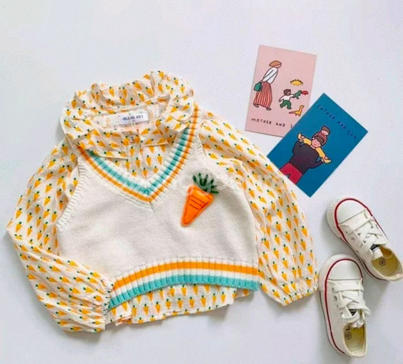 귀여운 니트 조끼와 셔츠 세트입니다 - 사이즈는 100입니다 - 당근 패턴이 포인트입니다 - 니트 소재로 부드럽고 따뜻합니다 - 조끼와 셔츠를 함께 또는 따로 코디할 수 있습니다 새상품 반품.환불 불가