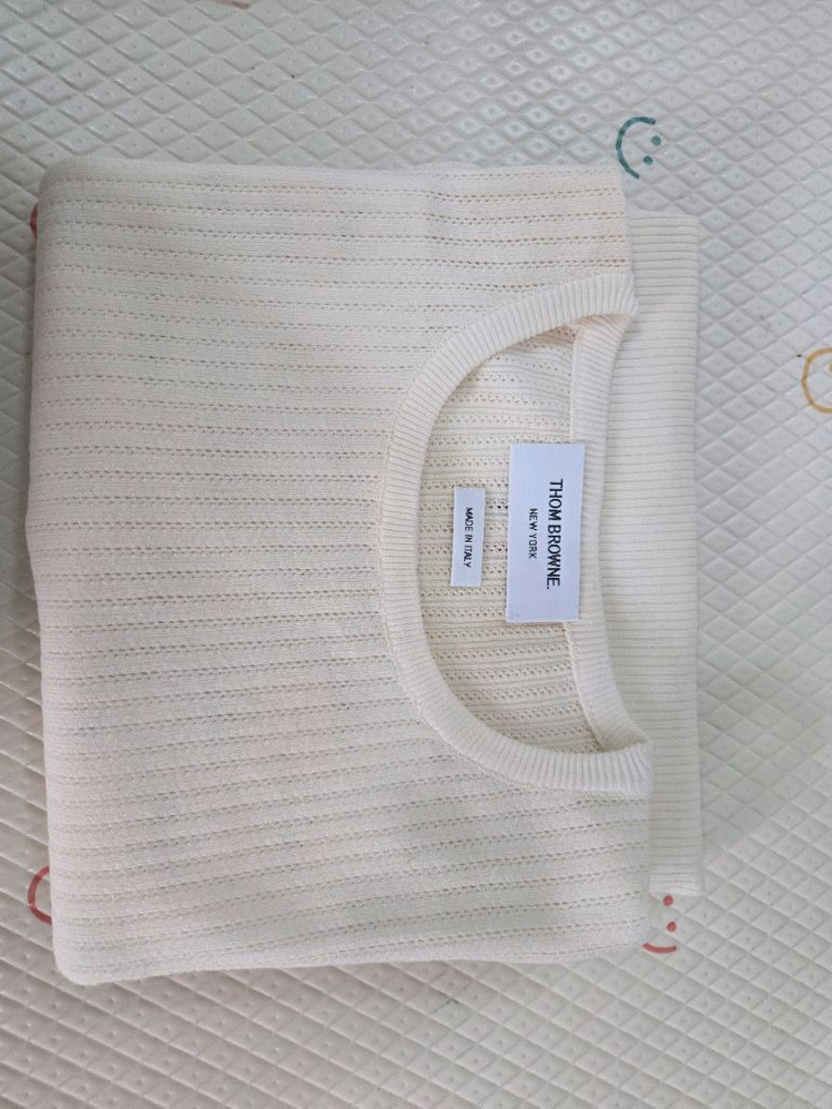 톰브라운 아이보리 니트 42사이즈 제품입니다. 상세 사이즈는 기록해 두었습니다. 얇은 니트 소재로 되어 있어서 지금 날씨에 입기 딱 좋아요. 백화점에서 구입한 제품 입니다.