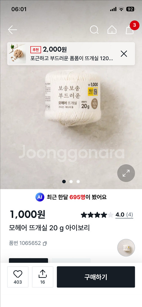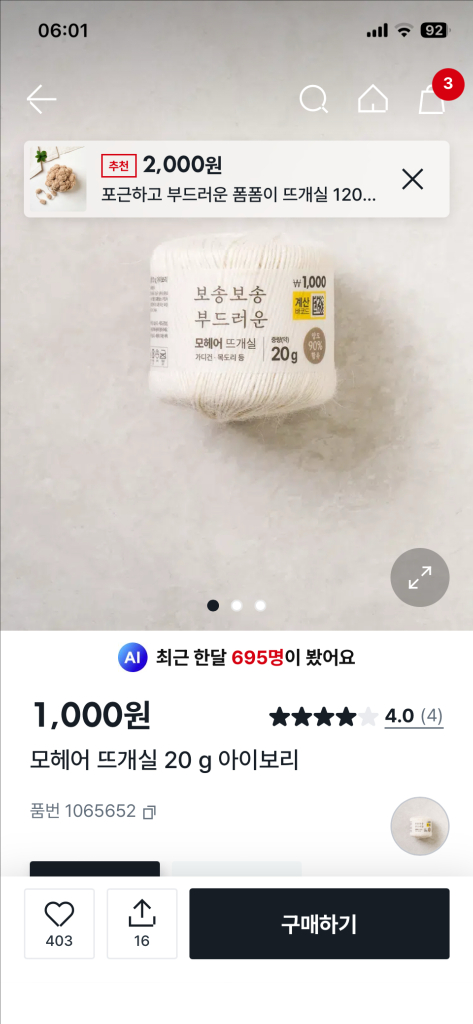 현재다이소 단종 뜨개실입니다 5볼있습니다 아이보리색 교환환불안됩니다 일괄 5천원 지금같은계절에 스카프뜨면예뻐요~ 인증사진은 챗주시면보내드려요 #다이소뜨개실