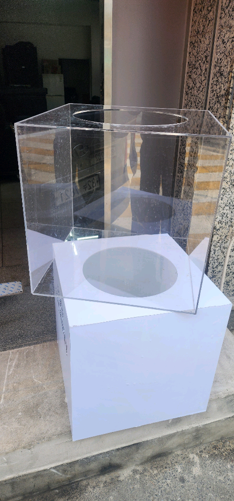 투명 아크릴 재질의 추첨함 또는 응모함입니다 상태는 깨끗합니다 대형 60×60 정 사각형입니다 네고 가능합니다 일괄입니다 제작품이라 40정도 들었습니다.