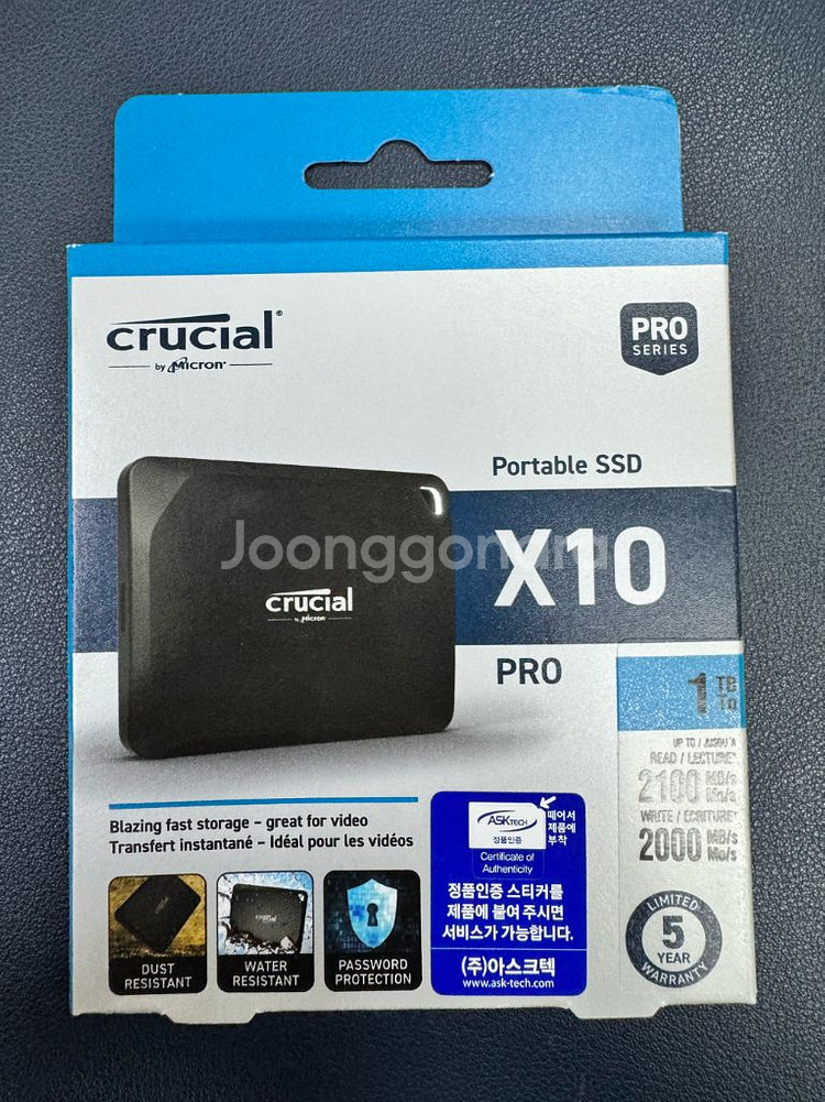 Crucial X10 Pro Portable 외장 SSD 1TB 새제품입니다(NVMe) - 최대 2100MB/s 읽기, 2000MB/s 쓰기 속도로 빠른 데이터 전송이 가능합니다 - 방수 및 방진 기능으로 안심하고 사용할 수 있습니다 - 5년 제한 보증으로 품질을 보장합니다 - 고해상도 사진 및 비디오 편집에 적합합니다 26년 3월초에 구매했고, 미개봉 상태입니다. 구매시 최저가 25만원에 구매했습니다. 몇일 사이 가격이 조금 더 올랐네요.. 속도 2000M 짜리입니다 국내 아스크텍 정품입니다. 4개 있습니다. 개당 가격이에요~ 문의주세요.