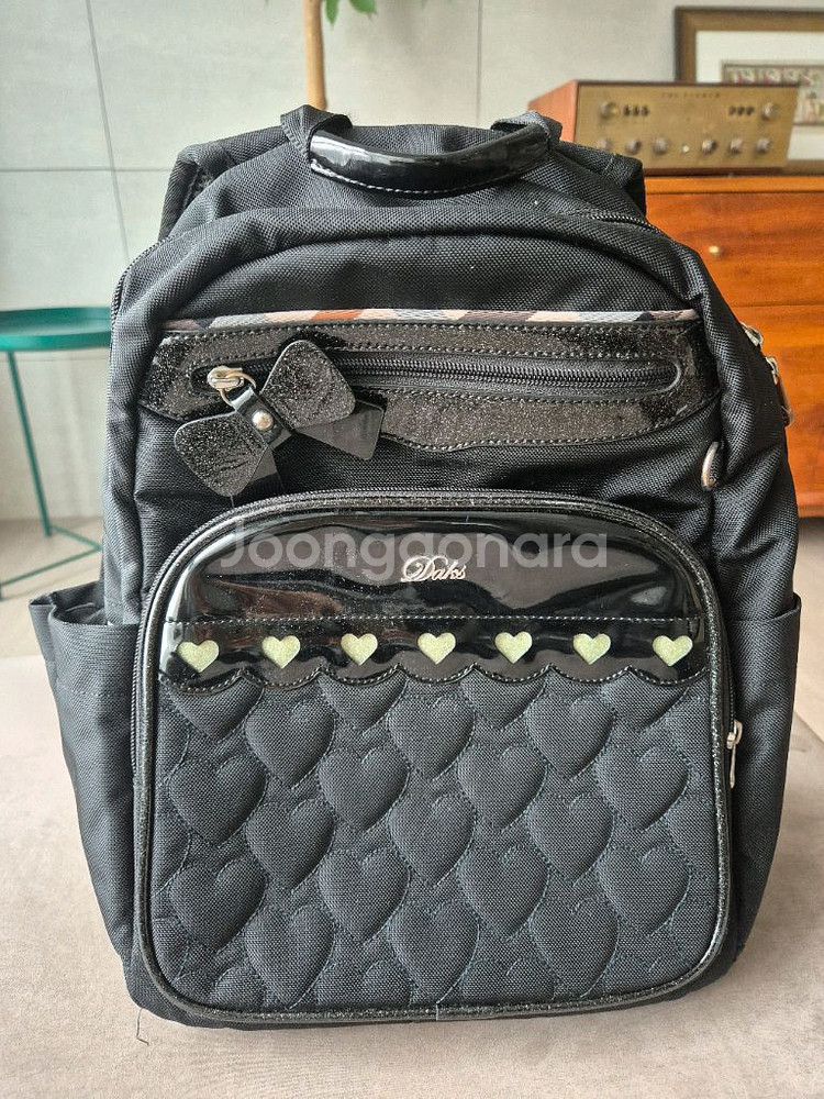 닥스 백팩과 신발주머니입니다. 앞면에 하트 모양 장식과 리본 디테일이 있어서 더욱 사랑스러워요. 사진에는 잘 표현이 안되지만 하트무늬와 리본쪽에 펄감이 있어요. 사용감은 있지만 전체적으로 깔끔한 상태입니다. 초등저학년이 사용하기 좋은 사이즈 입니다. 택배비 포함 15000원입니다.