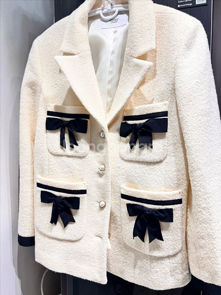 고급스러운 트위드 자켓이에요. 아이보리 컬러에 네이비 리본 포인트가 세련되고 우아한 느낌을 줍니다. 실착 1회 후 바로 임신 출산하며 보관만해서 새옷 상태입니다. 택포입니다. 구매가격은 488,000입니다.