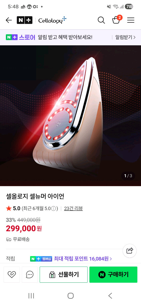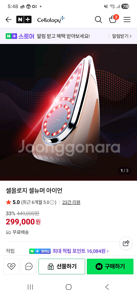 개인정보(거래정보)를 주고받는 행위는 사기에 노출될 수 있으므로 즉시 중고나라로 신고해 주세요미개봉 새제품 셀뉴머 아이언이에요. 피부 관리용 미용기기로 박스 상태도 깨끗합니다. 홈케어용으로 주름 피기 딱 좋아요!