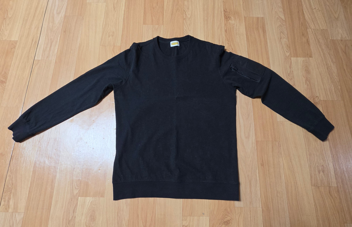 인터메조 INTERMEZZO 블랙 맨투맨 구입 후 미착용 보관 제품으로 옷장 정리하면서 판매합니다. 소매 밀리터리 포켓 디자인이라 포인트 있는 맨투맨입니다. 심플한 블랙이라 코디하기 좋습니다. 사이즈 : 105 실 측 : 어깨 46cm, 가슴 55cm, 소매 63cm, 총장 72cm