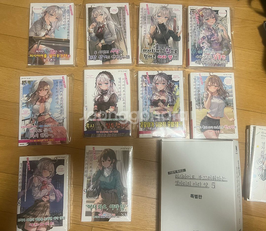 가끔씩 툭하고 러시아어로 부끄러워하는 옆자리 아랴양 라노벨 1권부터 9권까지 전부 초판이고 4.5권, 5권특별판, 6권 제외한 나머지 권들은 전부 미개봉입니다. 개봉한 상품들은 opp봉투에 담아서 깔끔한 상태로 보관했으며 특전들도 전부 잘 보관해놨습니다! 코믹스 1~3권 미개봉도 서비스로 챙겨드려요.