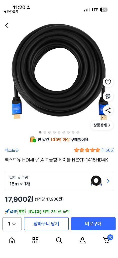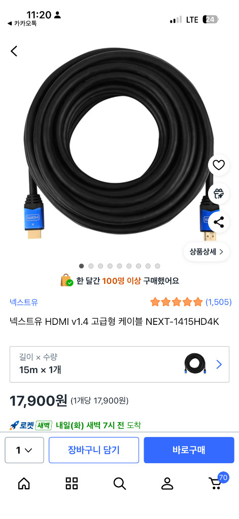 넥스트유 HDMI v1.4 고급형 케이블입니다 길이는 15m입니다 고화질 영상과 음향을 전송할 수 있습니다 검은색 HDMI 케이블입니다 비닐만뜯은 새상품입니다.