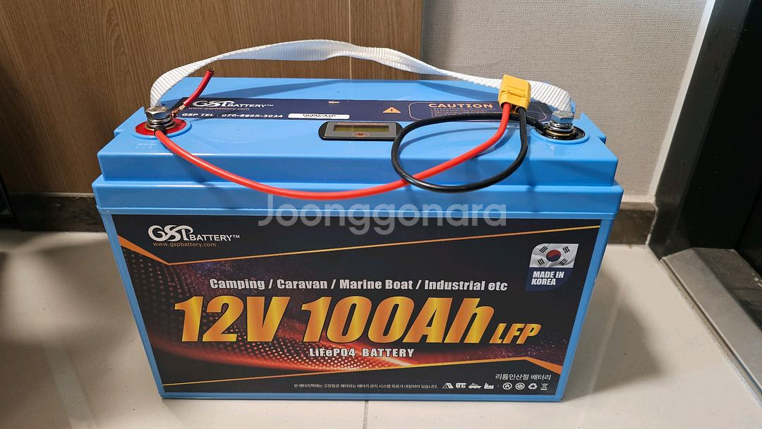 GSP 배터리 12V 100A 리튬인산철 배터리 + 전용 가정용 충전기 (20 A) 판매합니다. 국내제조 제품으로 저가 중국산과 다릅니다. 캠핑, 카라반, 보트, 산업용 등으로 사용하기 좋습니다. 원래 구매 가격은 90만원이었는데, 배터리 윗면에 내장되어 있는 배터리 잔량 확인 디스플레이가 고장나서 싸게 내놓습니다. (3번째 사진) 이외에는 외관도 매우 깨끗하고, 상태 좋습니다. (실사용 5회) 구매 후 환불 불가합니다.
