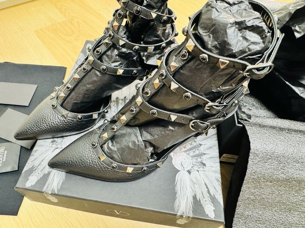 [정품] 발렌티노 가라바니 락스터드 앤 노아(NOIR) 펌프스 힐 (6.5cm) 품번: LW2S0375 사이즈: 38 (국내 약 245~250mm 추천) 색상: ONO (NERO / 블랙) 굽 높이: 6.5cm (미들힐로 착화감이 편안합니다) ### 제품 설명 발렌티노의 아이코닉한 락스터드 라인 중에서도 시크함이 돋보이는 '노아(NOIR)' 컬렉션입니다. 일반적인 골드 스터드가 아닌, 블랙 스톤과 루테늄 톤의 스터드가 매치되어 훨씬 고급스럽고 세련된 무드를 연출합니다. 특히 이 모델은 결이 살아있는 알체(Alce) 송아지 가죽을 사용하여 스크래치에 강하고 관리가 용이합니다. 너무 높지 않은 6.5cm 굽이라 데일리로 신기에도 부담 없고, 격식 있는 자리에서도 존재감이 확실한 아이템입니다. ### 제품 상태 구성품: 풀세트 (본품, 박스, 더스트백, 구두) 외관: 사진 보시다시피 가죽 상태 매우 훌륭하며 스터드 탈락 없습니다. 정품 각인 선명합니다. (사진 참고) ### 상세 정보 소재: 천연 가죽 (Stampa Alce) 제조국: MADE IN ITALY 거래 방식: 택배 거래 / gs25택배 직거래 가능 지역: (도래울로86)