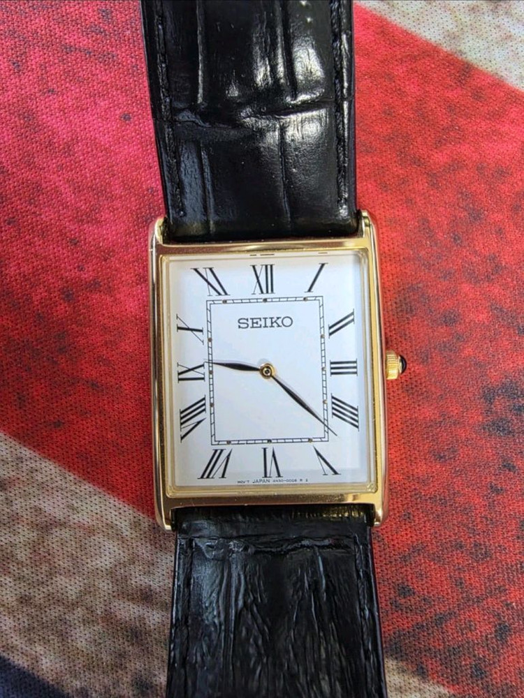세이코 탱크 스타일 드레스워치 판매합니다. 모델은 SWR052P1 / 4N30-00G0 입니다. 시계 단품이며, 전체적으로 깔끔한 편이고 생활기스 아주 조금 있는 정도입니다. 화이트 로만 다이얼에 골드톤 케이스, 블랙 가죽스트랩 조합이라 깔끔하고 클래식하게 착용하기 좋습니다. 현재 사진 그대로 보관 중이며, 직거래/택배 가능합니다. 중고거래 특성상 교환, 환불은 어려운 점 부탁드립니다. 궁금하신 점 없으시면 안전결제 해주시면 꼼꼼히 방탄포장하여서 택배 부쳐드릴게요!