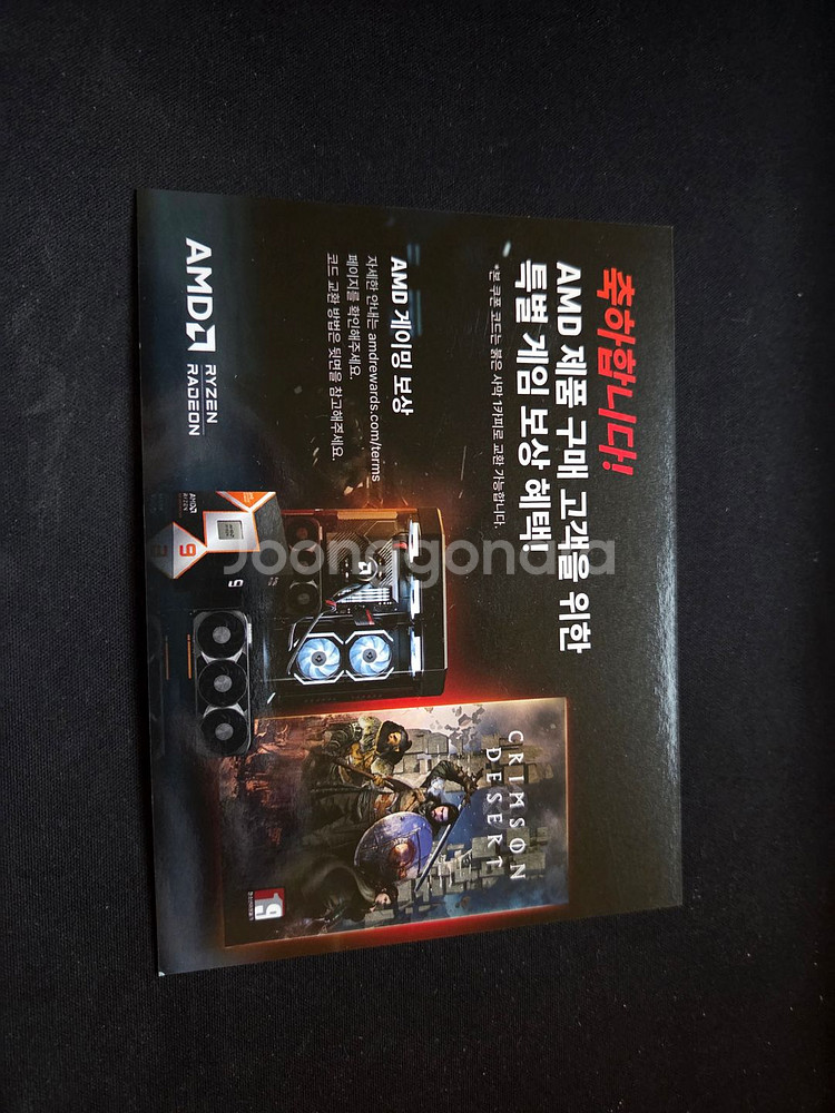 붉은사막 게임쿠폰 판매합니다. 9800X3D 시피유 구매하고 받은 쿠폰입니다. 9800X3D 시피유를 사용중이셔야지 등록되는거같아요. 은박부분 긁어서 사진으로 보내드릴수도있고 실물 원하시면 택배비 부담해주시는 조건으로 택배보내드립니다. (등기는 오래걸리고 택배보다 분실위험이 커서 택배로만 보냅니다) 안전결제 결제하시면 실물보내드리고 아니면 사진찍어드립니다. 대리등록 불가능한건 아니지만 하는방법을 잘 모릅니다. 이것저것 따지지않으실분에 한정해서 대리등록해드립니다. 게임쿠폰 특성상 구매하면 환불 절대불가능입니다. 은박 긁어 코드 보내드린순간부터 절대불가능입니다. 택배로 받으실때도 마찬가지입니다.