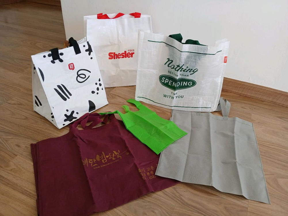 장바구니 6개 팝니다. 빨간 끈 타포린 40×40×20cm, 초록 끈 타포린 40×35×18cm, 오늘좋은 타포린 33×30×23cm, 자주색 한복 부직포 55×40×11cm, 회색 부직포 45×42cm, 연두색 부직포 30×20×10cm 깨끗하고 상태 양호, 모두 3,000원입니다. 서울시 상계9동 청원고등학교 후문 또는 지하철 7호선 마들역에서 직거래 가능합니다. GS 반값택배 2,700원 가능합니다. 에눌, 네고 사양합니다.