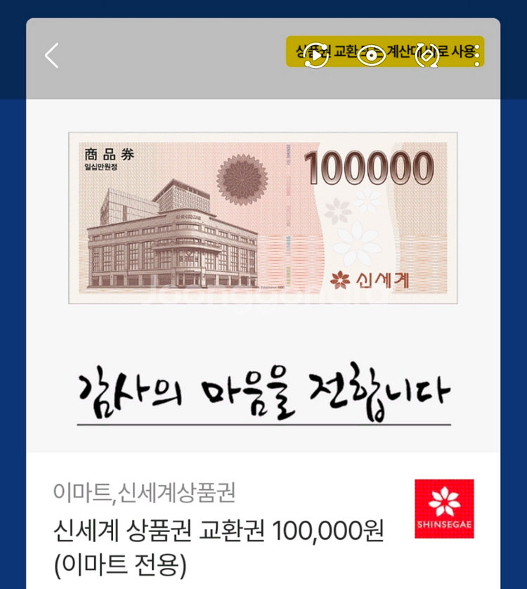 신세계 상품권 10만원 (이마트 전용) 이마트에서 사용할 수 있는 신세계 상품권입니다. 바코드를 통해 지류로 바꾸거나, 바꾸지 않고 계산대에서 바코드로 사용할 수 있습니다.(둘 중 한 가지 방법만 가능) 입금 확인 후 바로 보내드립니다