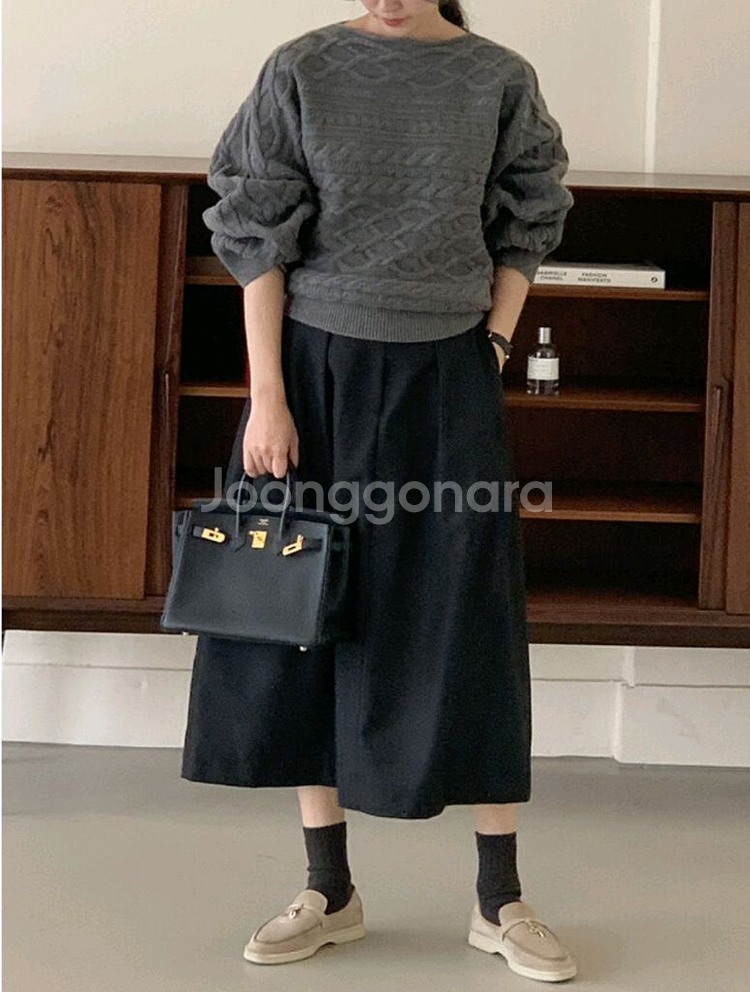 울 소재의 롱 스커트예요. 블랙 컬러로 어떤 상의와도 잘 어울리고, 상태 양호합니다. 따뜻하고 세련된 느낌으로 착용하기 좋아요.
