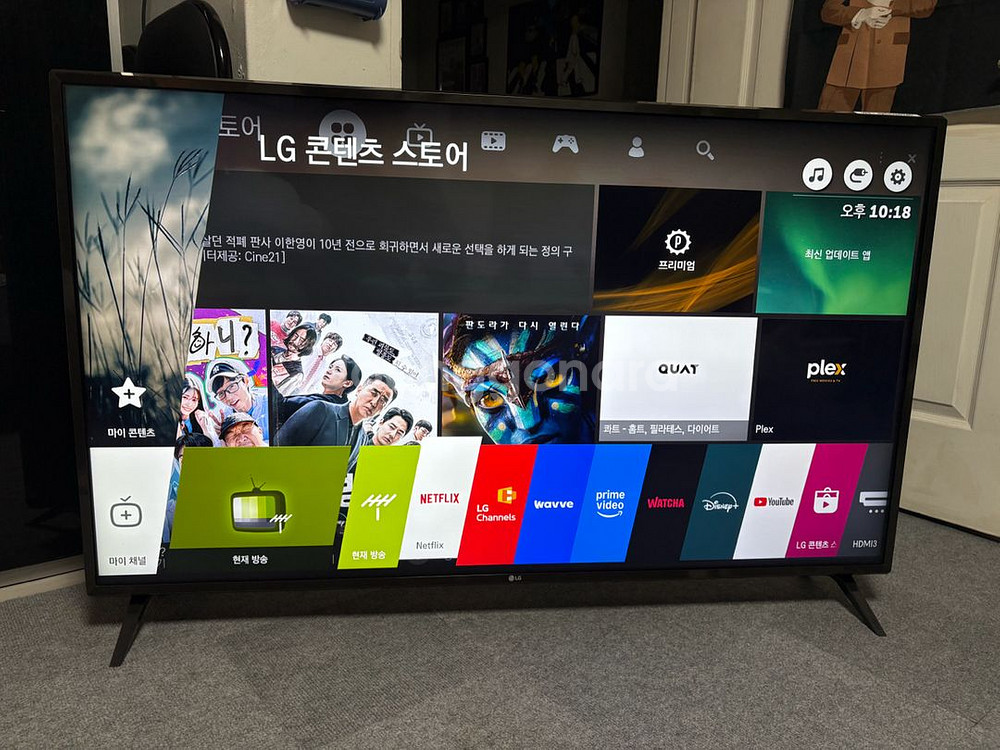 1. 제품명 : LG 55인치 4K 스마트TV 2. 가 격 : 40만 3. 설 명 : 화질 진짜 좋고 음질 최고입니다 저가형TV 보시다가 보면 확실히 달라요 눈의 피로도 훨씬 낮습니다 유튭, 넷플 등 ott왠만한건 다되요 구성품 : TV, 다리, 리모콘 직거래 : 인천