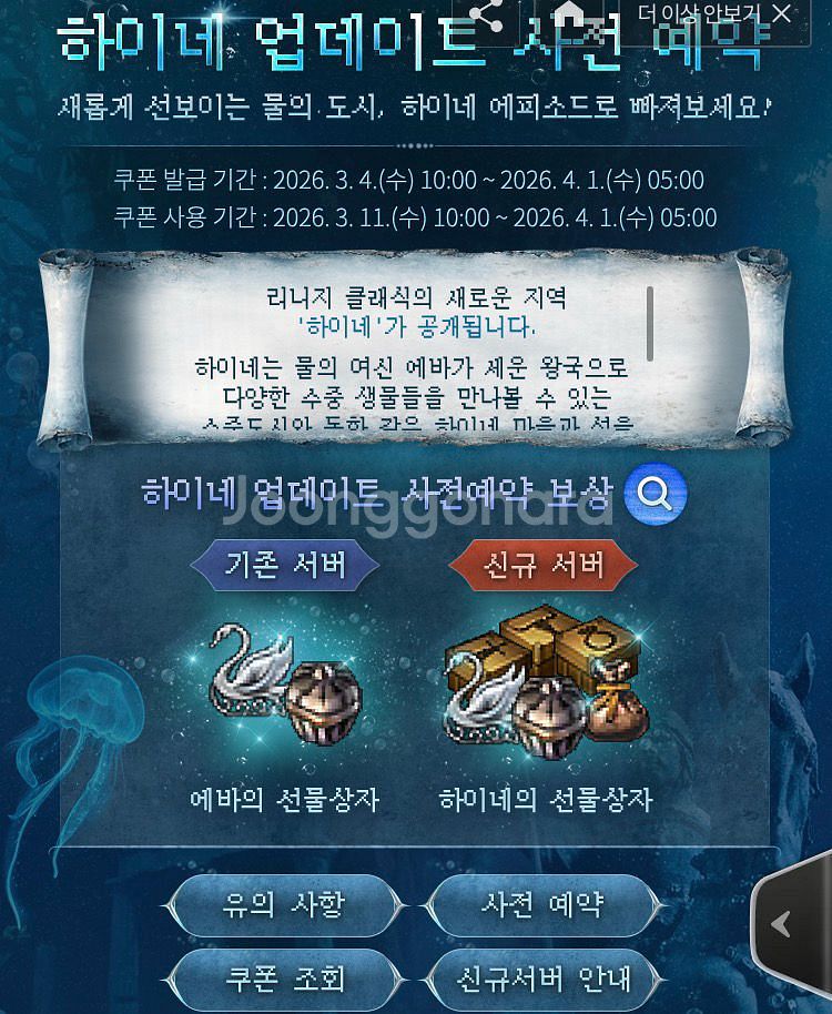 개인정보(거래정보)를 주고받는 행위는 사기에 노출될 수 있으므로 즉시 중고나라로 신고해 주세요리니지클래식 2차 사전예약쿠폰 하이네/로엔그린 신서버 전용 쿠폰입니다. 쿠폰 전송 후 환불 불가