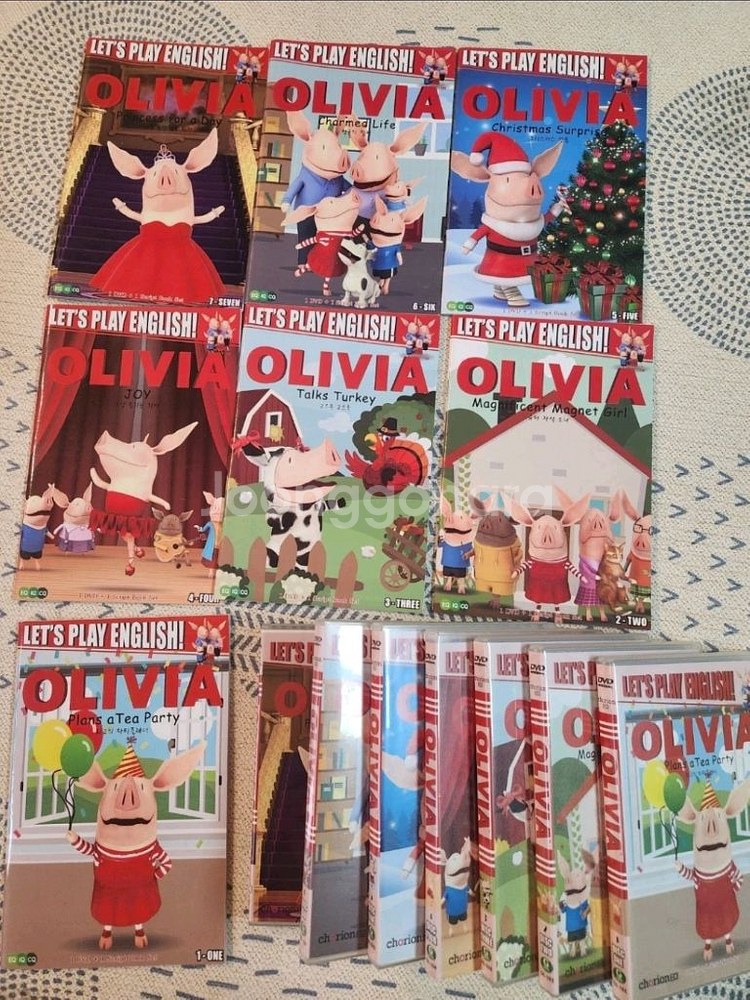 Let's play English 올리비아 (Olivia) dvd 7장입니다. 스크립트북(대본집)이 세트로 있어 영어공부하기 좋아요. (dvd 7개 + 짝꿍 해설집 7권) 하나의 dvd안에는 4개씩의 에피소드가 담겨있어요. (7번만 3개의 에피소드라 총 27개의 에피소드가 있습니다.) 정품이고 책 깨끗하고 상태좋으나 5번 대본집 첫장에 접힌자국. 7번대본집 윗부분이 물에 젖었다 마른흔적이 있어 저렴히 올려요. 사진 참고해주세요.