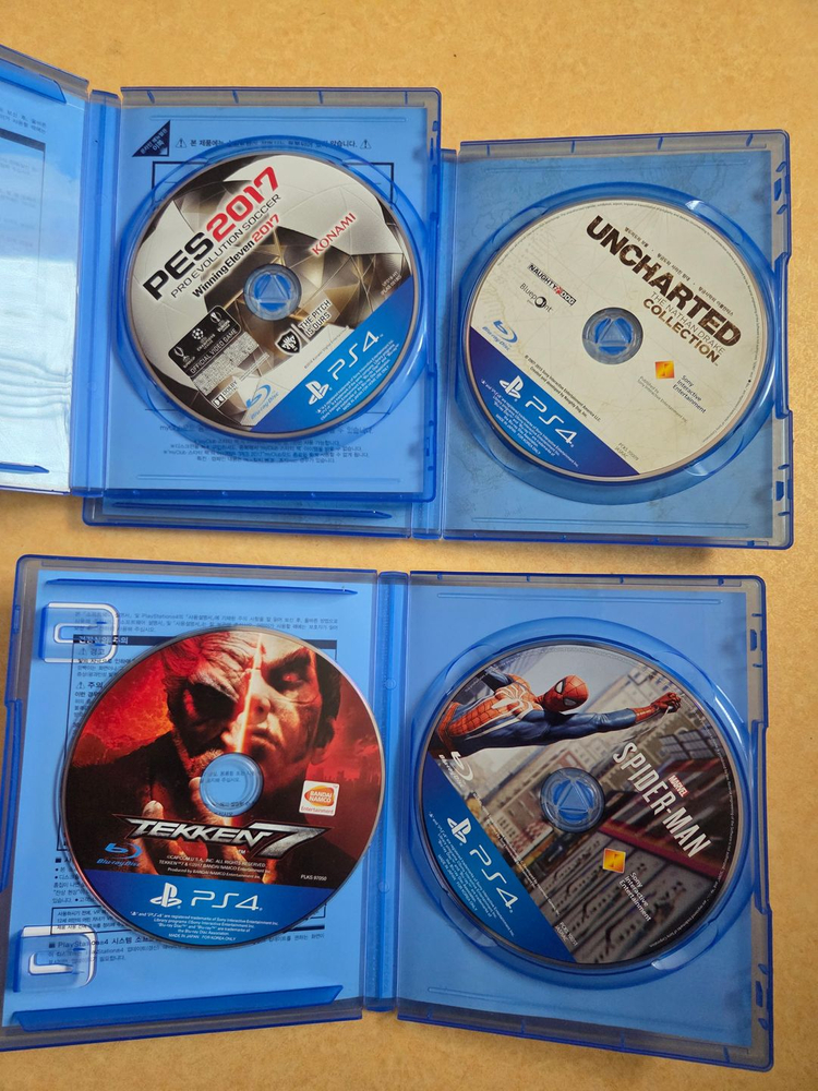 PS4용 pes 2017, 언차티드 컬렉션, 철권7, 스파이더맨 게임 일괄 팝니다. cu반값택배로 거래 가능합니다.(판매자부담) 구매하실분 연락주세요